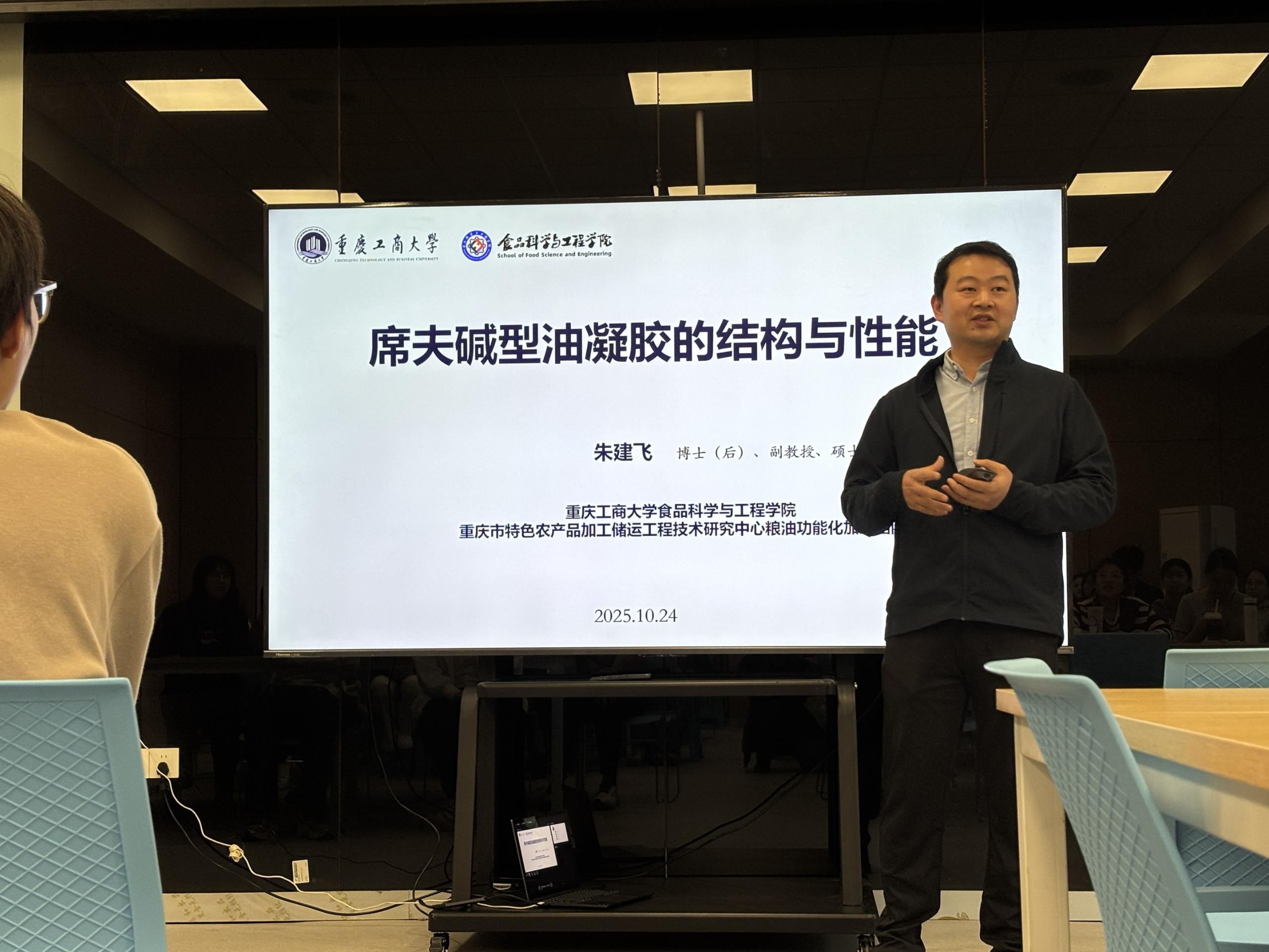 会上,朱建飞副教授以 “席夫碱型油凝胶的结构与性能” 为题开展专题分享,从分子结构解析、核心性能表征到食品领域应用前景等方面进行系统阐述,充分展现了学院扎实的学科功底与专业实力。