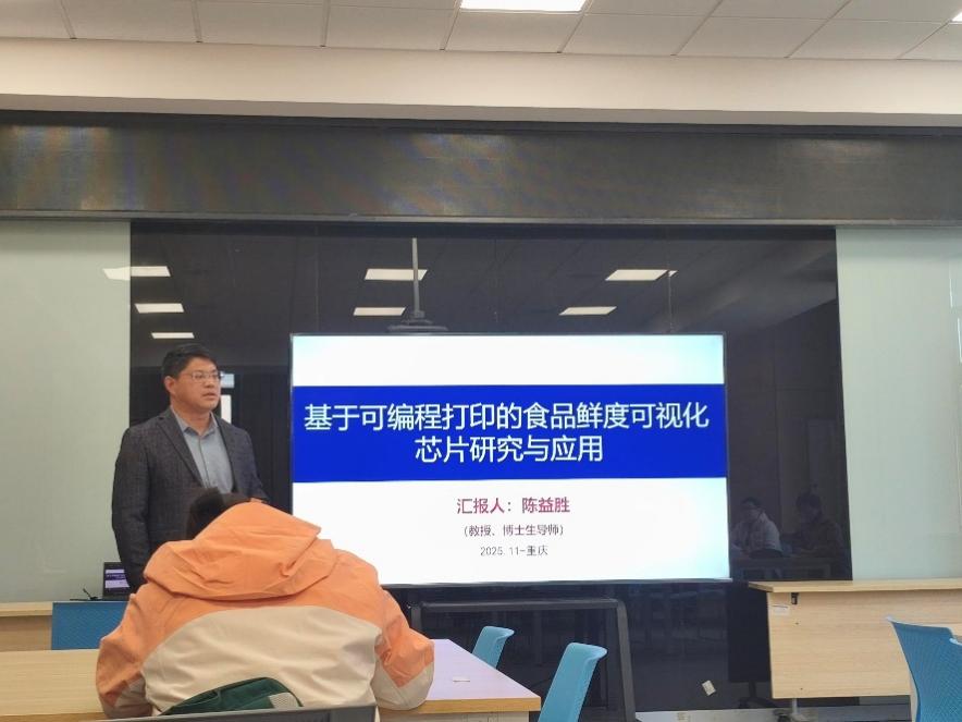 随后,陈益胜教授以“基于可编程打印的食品鲜度可视化芯片研究与应用”为题,从全球食品储运损耗的行业痛点出发,介绍了通过可编程打印传感材料实现新鲜度“可视化”的创新方案。该技术已在国家级项目中投入应用,引发了师生对成本控制与产业化可能性的深入探讨。