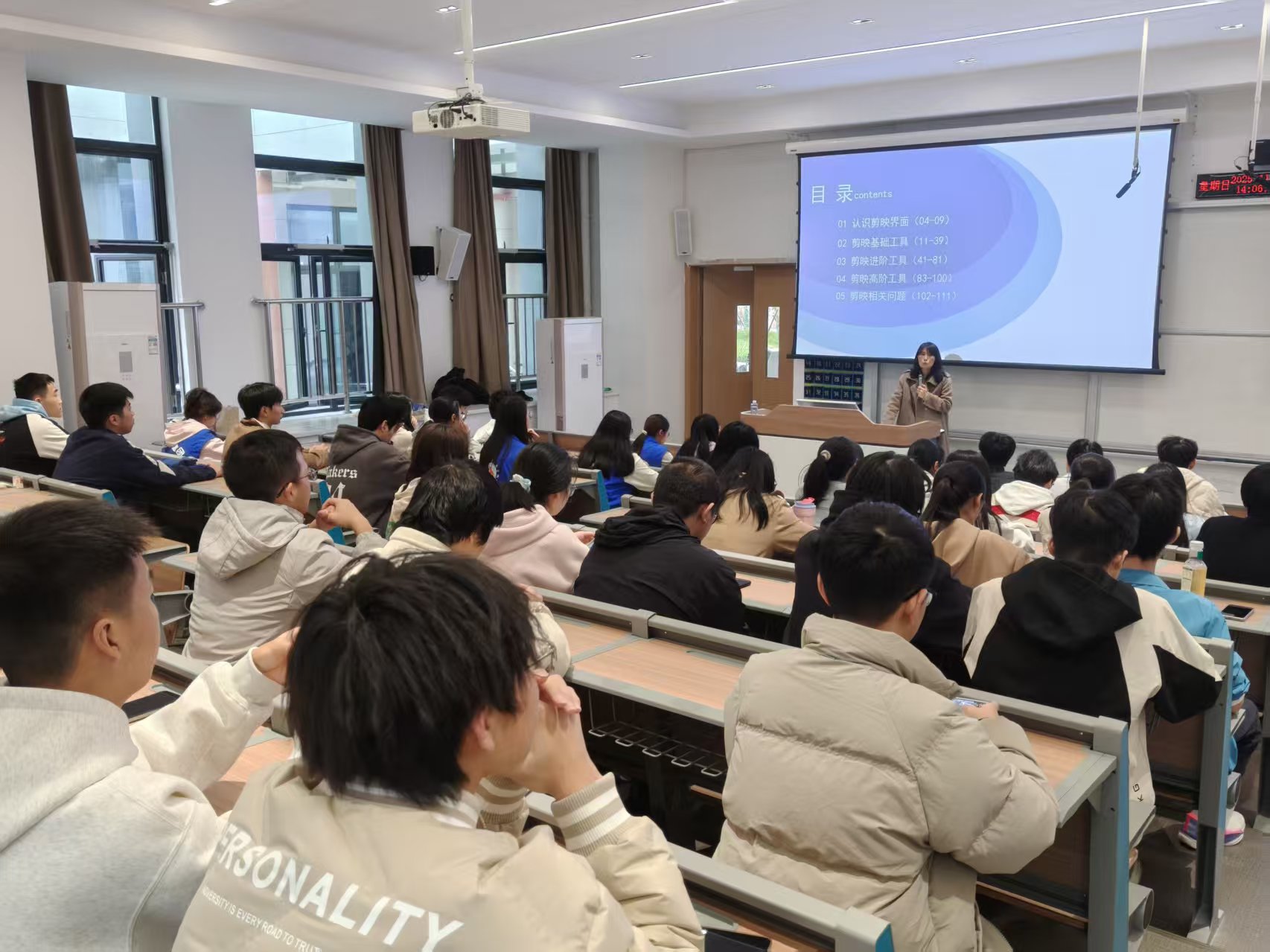 第二课堂拓展板块则以“光影创想”剪辑公开课为载体,聚焦学子数字技能提升与兴趣发展需求。11月16日,特邀王芳老师担任主讲人,面向各学院大一至大三学子系统讲解短视频创作知识。课程紧密结合热门趋势,从素材筛选、剪辑逻辑、转场设计到字幕添加、音效搭配等核心技能逐一拆解,通过“案例演示+实操指导”的模式帮助学子快速掌握基础剪辑工具使用方法。课堂上,学子们专注聆听、踊跃提问,王芳老师耐心解答各类疑难问题,浓厚的学习氛围贯穿始终。此次公开课不仅让学子掌握了实用的视频剪辑技能,更拓宽了综合素质发展路径,为其未来职业发展与个人成长增添助力。